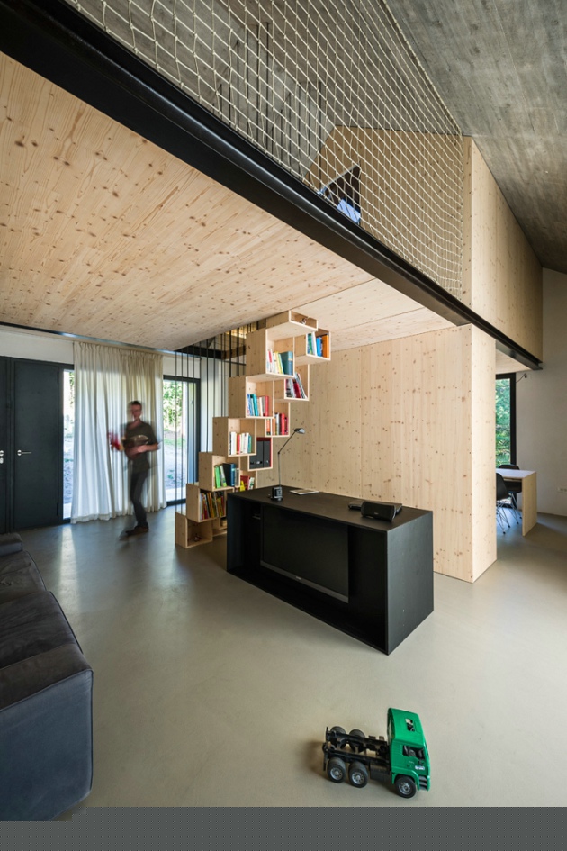 考虑到年轻家庭的需求,紧凑的结构设计结合当代的设计理念。整个内部是一个木制空间,由一个木制楼梯将整个空间做了一个划分,被分为了半开放和私密的两个空间。底层拥有一个开敞的落地大窗,窗外的景观都能够尽收眼底,而这也就成为了房屋的活动空间。厨房,用餐区还有浴室都被合理的安排在了这里。楼上则是主人房与儿童房的一个组合空间,搭配上了天窗的设计,似乎在封闭式的二楼多了些别样的情调。