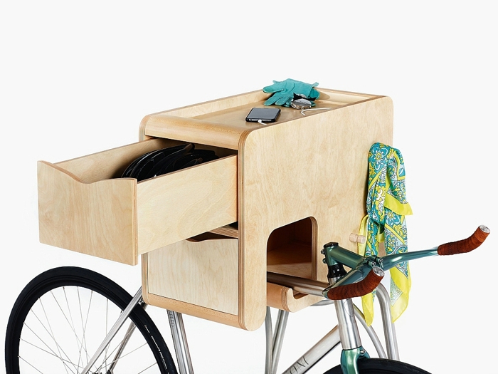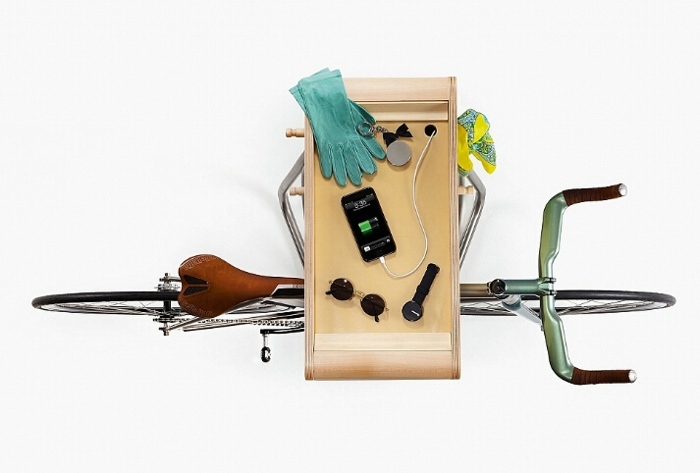 基于此难题,设计师Vadolibero开发了一个自行车悬挂系统,可以安装在公寓的任何角落。不仅可以满足自行车爱好者存放自行车的需求,又可用作房间的储物柜。这款自行车悬挂系统,可以自由移动,置于房间的任意角落。其自带的抽屉可以供自行车爱好者存放任何相关的配件,诸如钥匙,水瓶,手套等,另外其上面还有衣钩,可以悬挂头盔。除了灵活之外,它可以适用于任何大小的自行车。