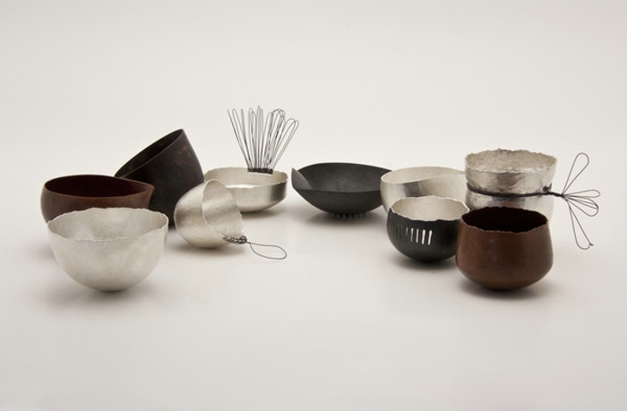无论这个成型的器皿是容器,筛子,勺子还是碗儿,都需要用眼睛去衡量碗口的深浅,用心去思考其能给使用者带来什么价值。因为某一天到这个碗儿出现在某一桌台上,一对双手将欢握它的表面,食材所散发出的温度,或温暖或寒冷,都将通过这一层层金属传递到手心里;也正是一次次的亲密接触,让外层的金属光泽越发清澈透亮。