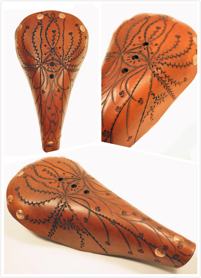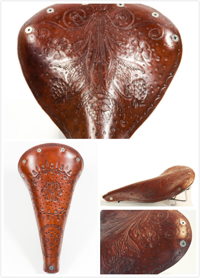 这些皮具自行车坐垫加工工艺精湛,坐垫表面的皮具浅雕,或是自然界中的繁花、鸟兽,或是带有部落民俗风情,又或是繁复纹理的精细化重复,每个都足够惊艳。而惊艳的背后,则是艺术家对皮具处理的精益求精: