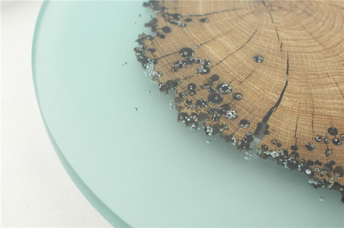 这个系列呈现了水中的木头横截面的独特工艺,超越普通的感知,有些作品还呈现了阳光经海水过滤所产生的效果,用海蓝宝石树脂和气泡填充木头的内部空隙,使木材呈现出原始的模样,保持了水下截面的样貌,显得坦白诚恳,有时日赋予的斑驳,却掩不住内心坚实的韧劲,乍看海中光影琉璃,一片光影斑斓。