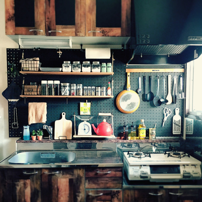 有十八般武艺就有十八般兵器,各式各样的厨具收纳起来也是很令人头痛的。这样挂起来,不但使用起来更方便,在视觉上是不是也整齐有序多了?黑色挂物板看起来时尚简约很耐脏,木制挂物板则让人感到温馨舒适,非常符合时下文艺青年的品味。挂物板上的孔还用来可以做置物架。