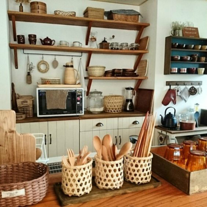 不论是“柴米油盐酱醋茶”还是“琴棋书画诗酒茶”,或养身,或养心,现代人总是端着一杯茶或者咖啡,品味四季,品淡人生。有条件的话,相信很多人都会在厨房或者客厅,设置这样一个茶水间。茶罐、咖啡罐和藤编收纳筐可以说是营造大自然气氛的绝佳组合,收集同种颜色的收纳筐也比较容易。