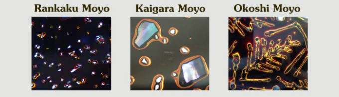 若狭涂分为三种:Rankaku Moyo、Kaigara Moyo以及Okoshi Moyo。其中Rankaku Moyo和Kaigara Moyo都是将装饰物嵌入到器物表面上,而Okoshi Moyo则有点像阴刻,先将装饰物放在器物表面,然后在周围上漆,之后再将装饰物拿掉,只保留其艺术形状在漆干的器物上。这些图案的轮廓会用多种颜色勾勒出来,看上去既华贵又平和。