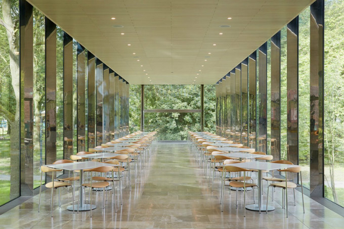 其实,一座优秀的美术馆在承载展览的同时,其本身也可以被看作是一件艺术品。那我想Whitworth必须得在“优秀美术馆”的名单里。美术馆的主体由优雅的玻璃和不锈钢管、红砖打造,位于建筑后面的两翼延伸到相邻的whitworth公园中。景观画廊部分为景观作品和大尺度雕塑作品提供了展览空间。整个长廊里,一个美丽的线性咖啡厅延伸到Whitworth公园的树木之中。