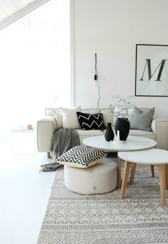 白色的桌面,木质的桌腿儿,优雅的线条,圆润的造型,极具北欧风的小茶几,搭配原木色的地板、图案简约的手工编织地毯或棕色和白色的牛皮地毯,浅灰色的沙发,一个自然清新、柔和充满质感的空间肯定能融化你。