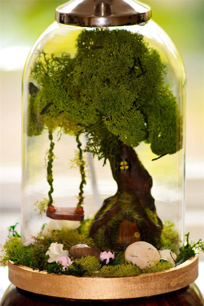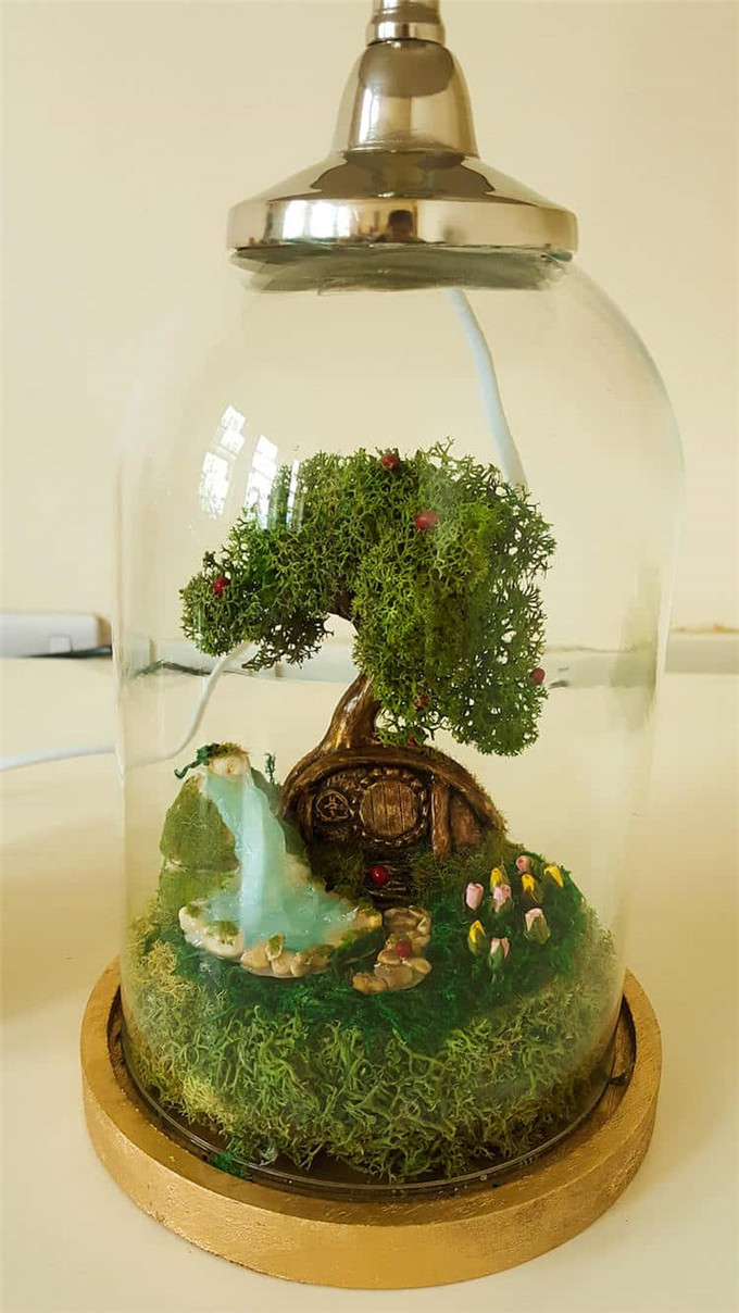 每个灯都有一个玻璃基座,场景的制作是从聚合物粘土中雕刻出来的树木,人造花和“溪流”,并且覆盖干苔。 如果仔细观察,你还可以找到童话书的元素,比如小型霍比特人大小的门。