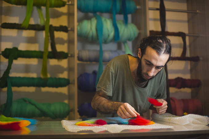 Sabri Tunca只购进白色的毛毡,然后自己染色。整个染色过程是自由轻松的。