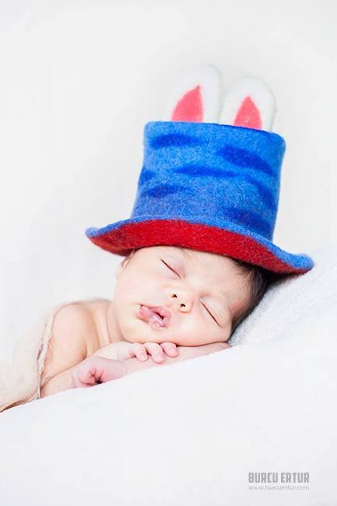 Sabri Tunca还为小baby特意设计制作了几顶帽子。选择了马卡龙色和其他较为明亮的颜色的小baby帽子则更加软萌可爱了!造型也十分可爱适合。