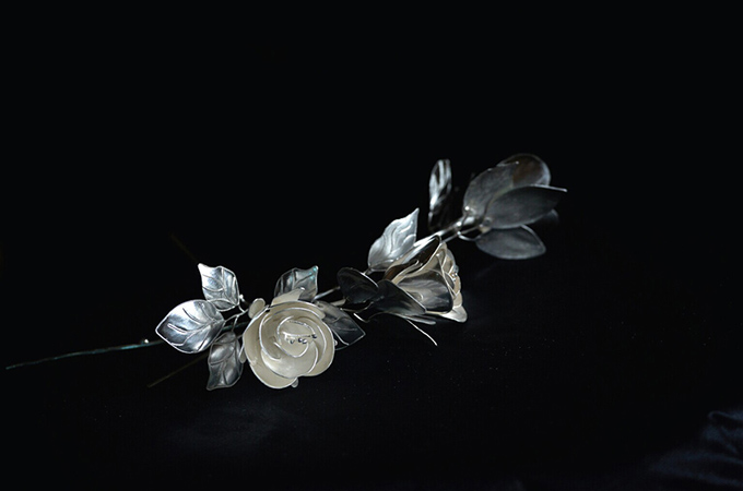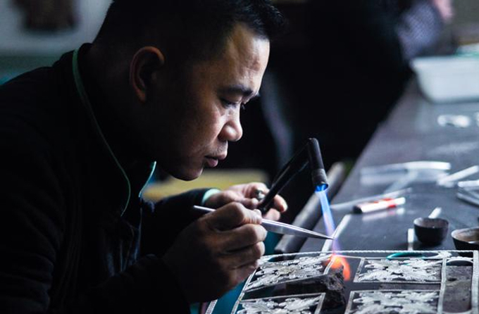 直到银器变红后,需要在银器最滚烫的时候粘上装饰,有时候是一朵朵细小的银花,有时候是一根根如发丝的银线,这一工序极其考验功夫。然后需要进行新一轮的吹烧、擦洗、抛光等一系列环节后,才能完成一枚枚小戒指或者一个小金锁。