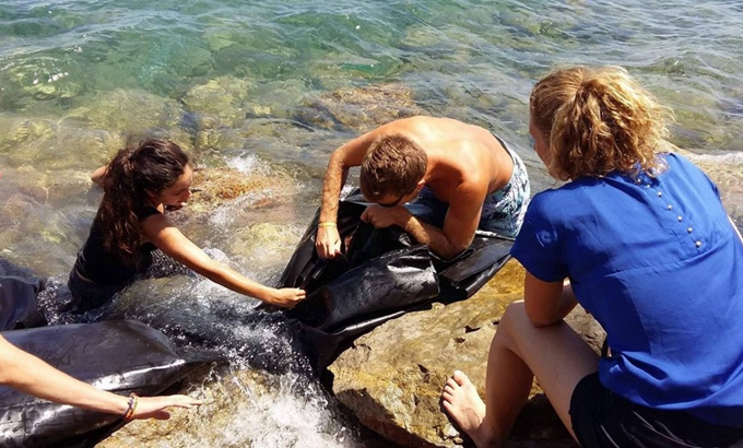 ↑希腊的志愿者们正用海水清理难民留下的橡皮艇。