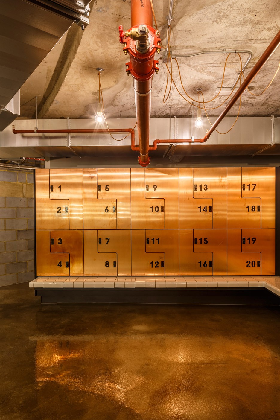 深色的整体背景氛围,发光的霓虹灯管,银色的天花板,做旧的黄铜灯管与白色瓷砖。使得这座健身房宛如《浴血黑帮》的拍摄现场,正在上演阴谋和背叛的故事。
