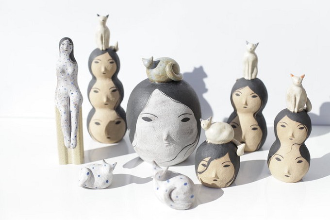 除了微表情外,Rami Kim 还制作过一组女子与猫的雕塑作品,这些女子有着黑头发黄皮肤,与宽眼距和小五官相结合,看起来像极了花木兰。