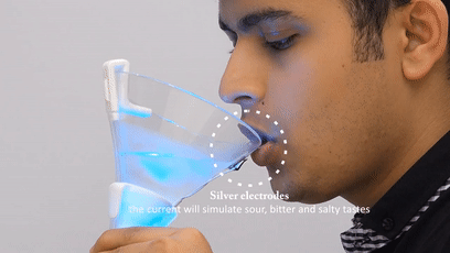 这种可通电的微电流装置会通过刺激我们的舌头,让我们觉得哪怕喝白开水也能喝出饮料味。