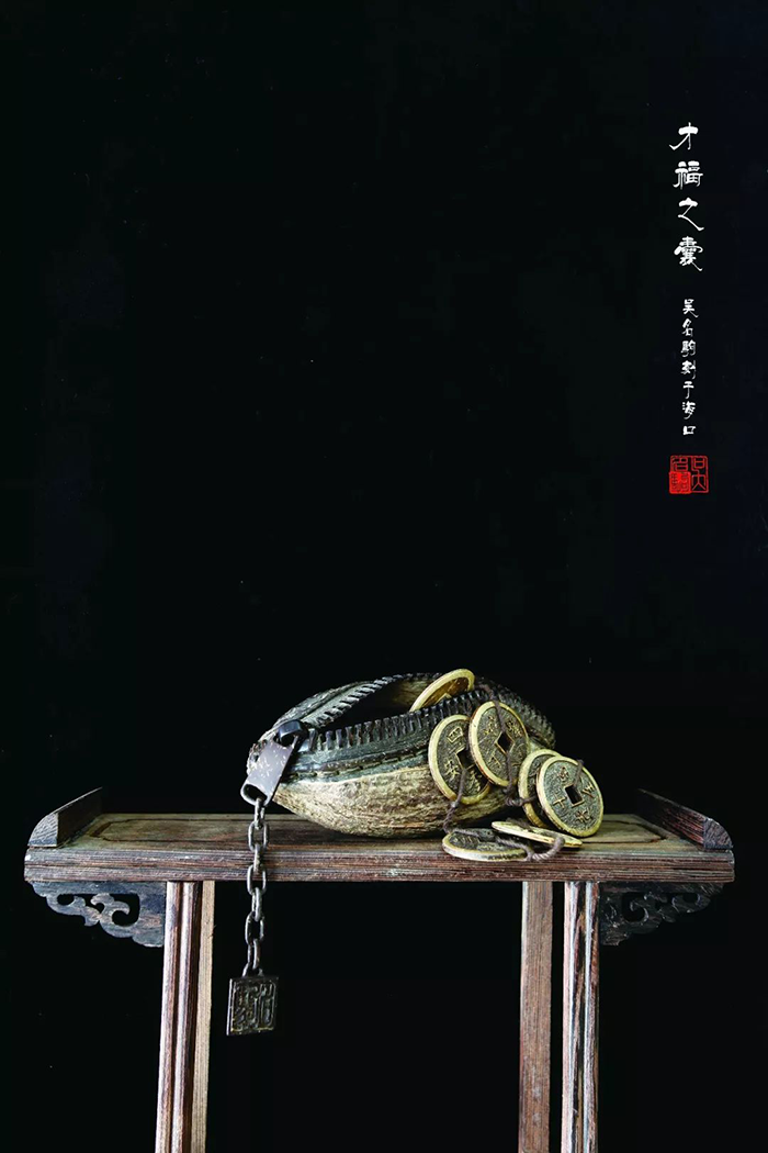 2019新中国成立70周年,吴名驹创作了作品《才福之囊》献给祖国——在10枚椰壳古币上雕刻10句不同的祝福语,表达对新中国的祝福。