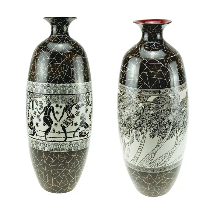 符史琼的代表作2米多高的大花瓶《吉祥如意樽》就是采用了 “椰贝合雕”的制作工艺,用了2万片的椰片,每一片椰片的颜色都要和谐,之间的衔接也都不能留痕迹,经过十多道工序,耗时一年才完成,有人曾开出50万元的高价想买,但是符史琼没有卖。