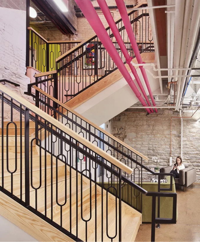 一座复古的铁艺栏杆楼梯(象征着力量和社区),将一楼开放休闲区和下层的办公套间紧密联系在一起。