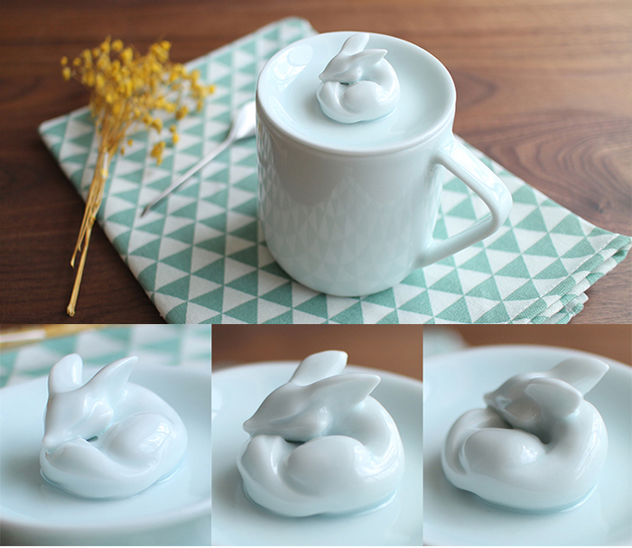 两款杯子上的小狐狸形象经过数次修改才最终定版,乖巧静怡,釉色上依然沿用鹿隐杯的影青釉,色泽柔和淡雅,温润如玉。