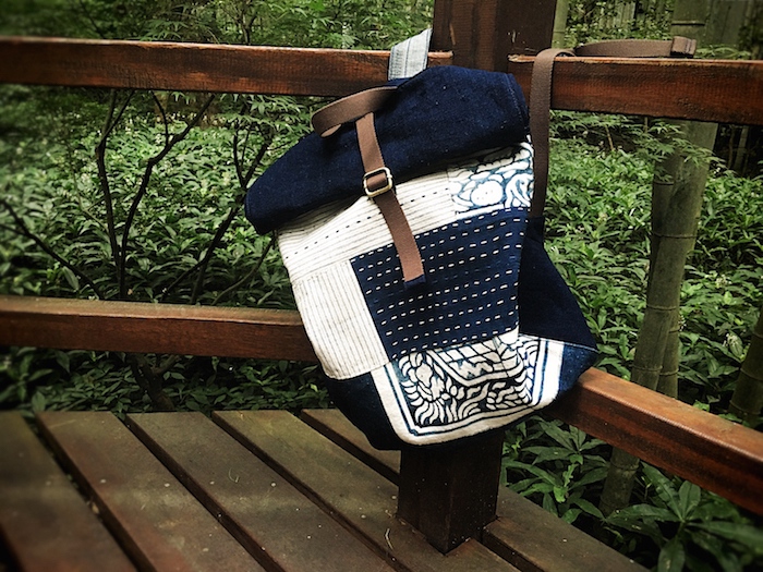 「行者」包采用了拼布的设计手法,把蓝夹缬布和不同的手工织染的老土布组合,打破了蓝夹缬方块图案单一刻板的视觉印象。外型设计上也并不走传统路线,相反卷口双肩包表现出了一些潮牌风格。