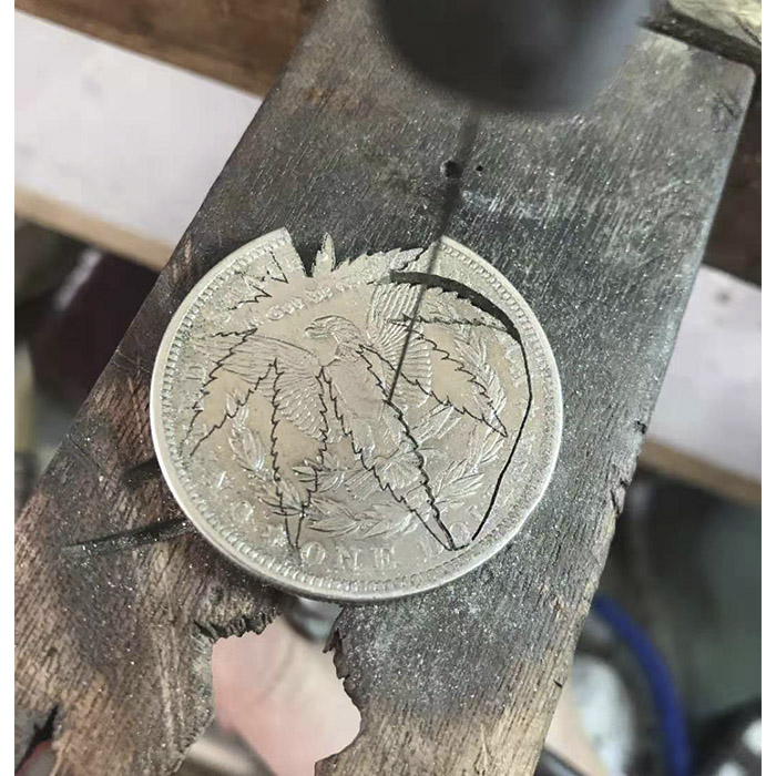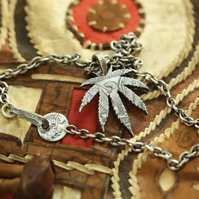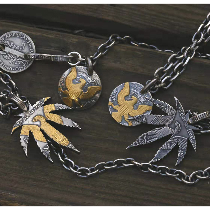 由 ST.Z STUDIO 出品的匠人手工美国古董摩根一美元银币麻叶项坠。银币选用美国古董摩根一美元银币,经过匠人李折先生精湛的手工技艺制作,通过细腻的手工打磨、抛光、旧化等多道工序制成,并将银币原有的鹰徽与人像保留于正反两面。