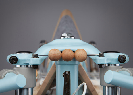 摩托车的框架是用淡蓝色漆的金属制成,但其车身几乎都是用木材制作,JVLT014在摩托车领域可算是不同寻常,不同寻常的还不止车身的设计,它的前照灯和油箱也很独特,前照灯的灵感来自于台灯的构造,可以探照多个方向;再一个就是汽油箱,用玻璃制做,还用软木塞来塞住油箱口,这样的油箱都可以当做花瓶来使用了。接着说到的是座椅,其座椅同样还是用皮革制成,在座椅上放置了一块毛毡。里程表被一个酷似小算盘的装饰给取代了,JVLT014设计团队将这辆摩托车给简化了,但是发动机缸体仍然存在,其双排气管还延伸至车尾。