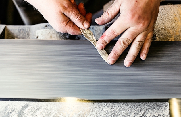 这一个步骤是将切割好的牛角料放入165°的热油里经过几分钟的高温然后再放置一旁冷却,这样的一个过程会使得原本坚硬的牛角料变得像皮革般的柔软,也使得最后的定型工作变得容易了许多。