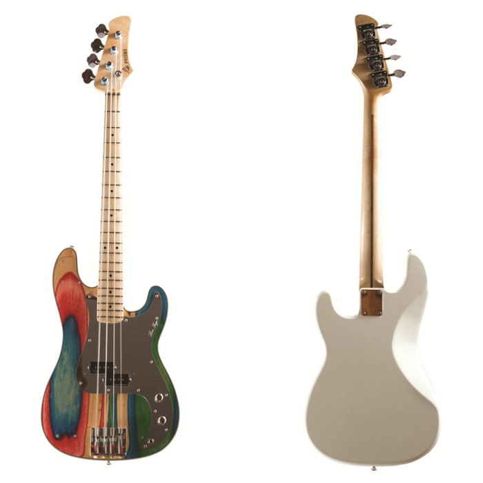 “从他的演奏风格到设计美感,我考虑了很多细节。这个贝司的琴箱采用涂染成黄白色的桤木,而琴头取材于滑板,并涂上了与WestHam队服十分接近的颜色,然后再用激光切割下特殊定制的镜面作为琴身护板,并把它涂染成了黑白相间的颜色,再现原创的经典吉他。”