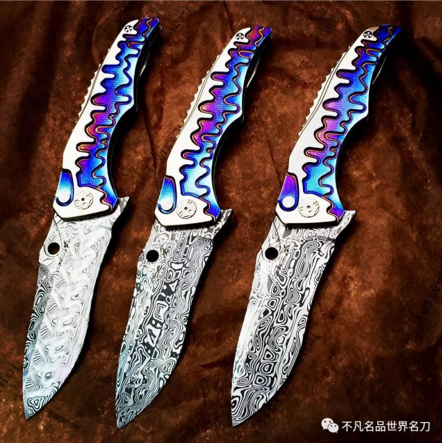 目前他专门制造高品质的战术刀。比如图中的此款刀刃,是以炫彩大马士革作为刃材,中心主轴采用炫彩大马圈装配,采用分段研磨技术。柄材选用了碳纤维一体柄结构,一改常态的钛合金一体柄。
